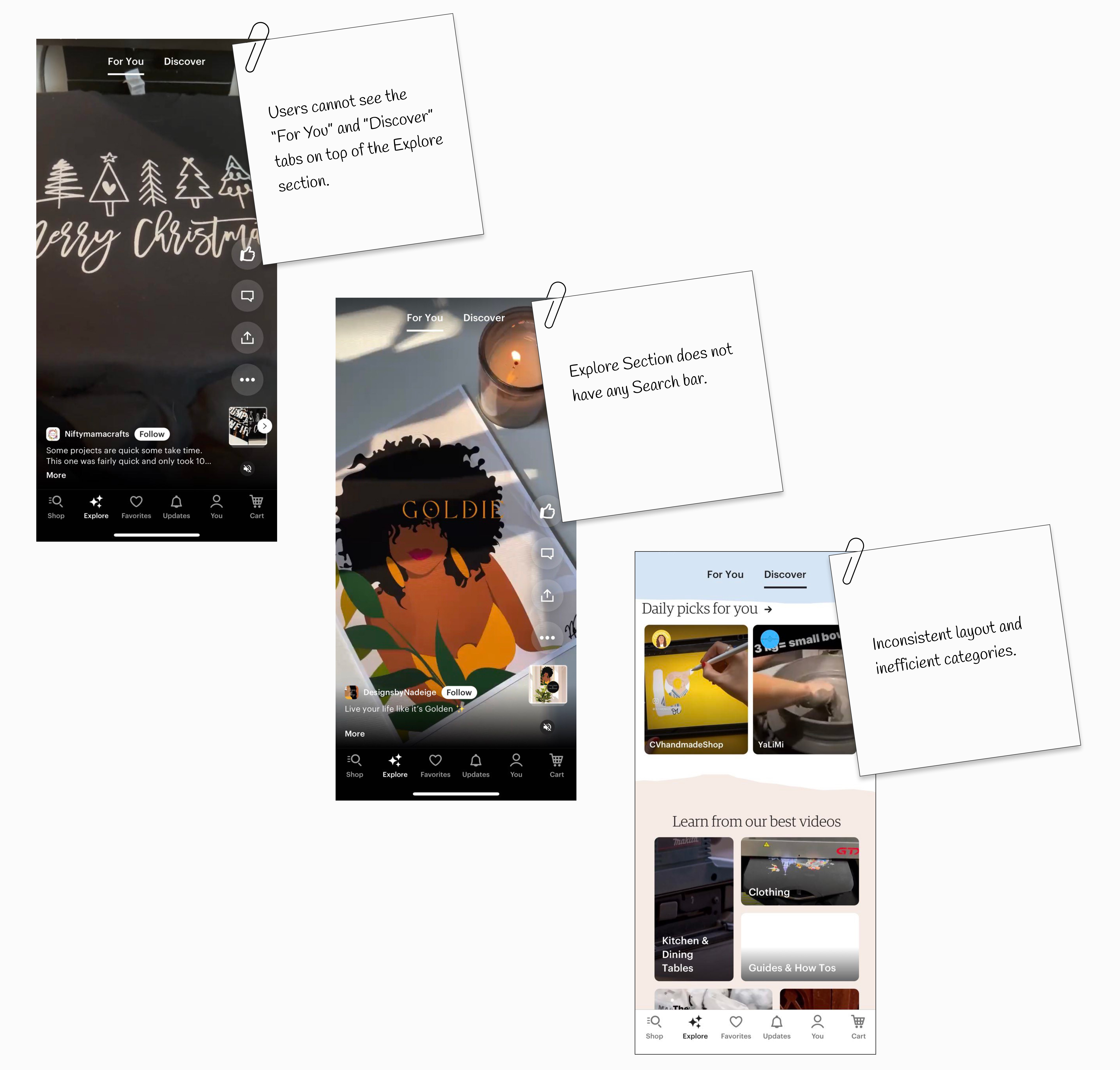 We conducted a competitive analysis to compare Etsy's explore section with selected apps such as Amazon, Instagram